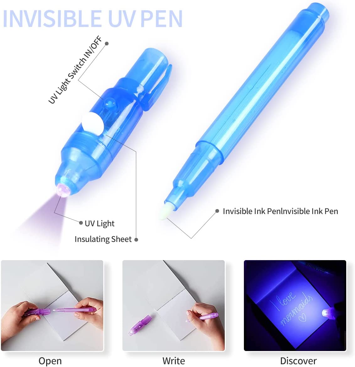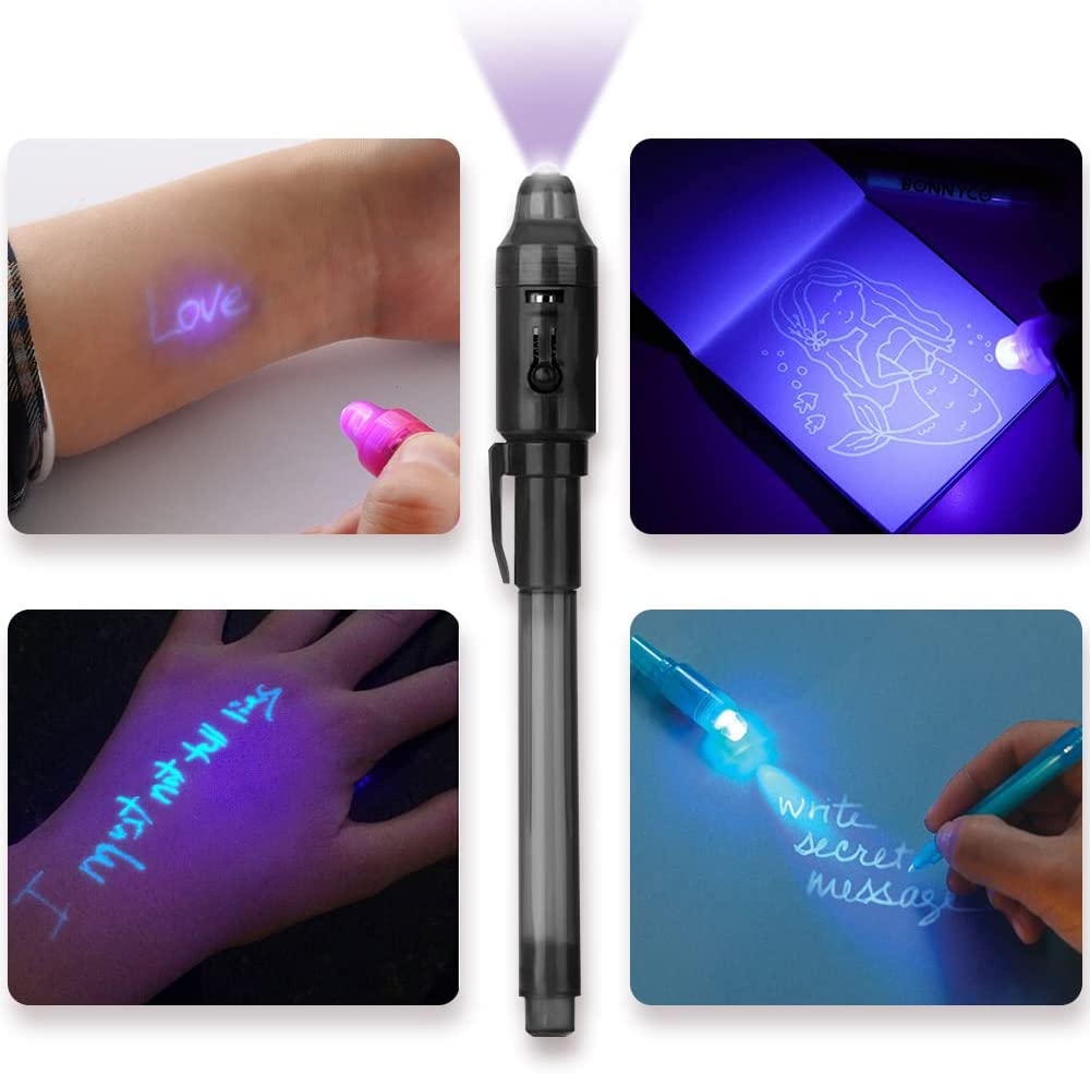 - Send invisible messages: each with invisible ink one end and a UV light the other end. Text is invisible, and then make them visible again when you light up the messages with UV light.