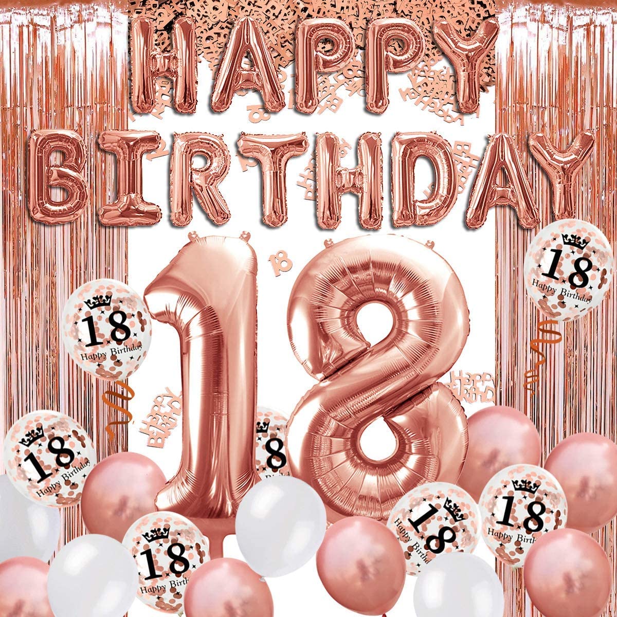 - XXL Rose Gold 18 Birthday party Supplies: incl. 40inch rose gold 18 number, 2pcs fringe curtains, 13pcs happy birthday banner ballons, 16pcs rose gold & white balloons, 8pcs rose gold confetti balloons, 10g Happy Birthday confetti & 18 numbers confetti. 2pcs balloons strings. Support helium or air.