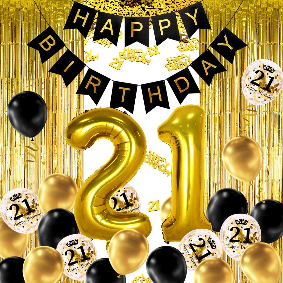 - XXL Gold 21 Birthday decoration: incl. giant gold 21 number , 2 gold fringe curtain, 13 happy birthday banner, 16 black gold latex balloons, 8 gold confetti balloons, 10g Happy Birthday confetti 21 numbers confetti. 2 rolls balloons strings. All support helium or air. Enough to decorate a party!