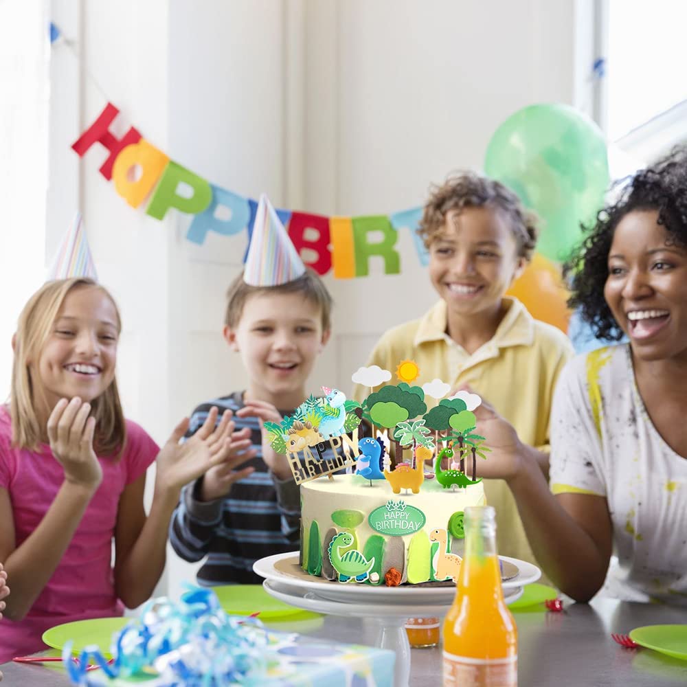 - ♕ 3D Dinosaur Cake Toppers Set: includes 1big jungle dinodaur happy birthday cake topper, 3pcs 3D dinosaur , 2pcs forest tree, 3pcs coconut tree, 4pcs cloud sun, 8pcs paper dinosaur cupcake Toppers.