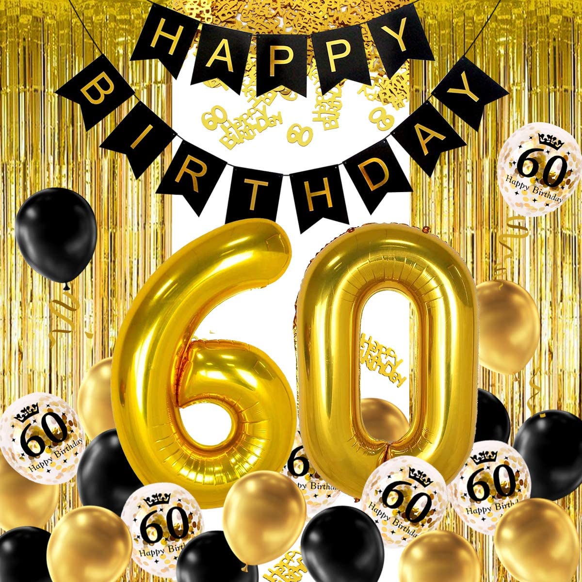 - XXL Gold 60 Birthday decoration: incl. giant gold 60 number, 2 gold fringe curtain, 13 happy birthday banner, 16 black gold latex balloons, 8 gold confetti balloons, 10g Happy Birthday confetti 60 numbers confetti. 2 rolls balloons strings. All support helium or air. Enough to decorate a party!