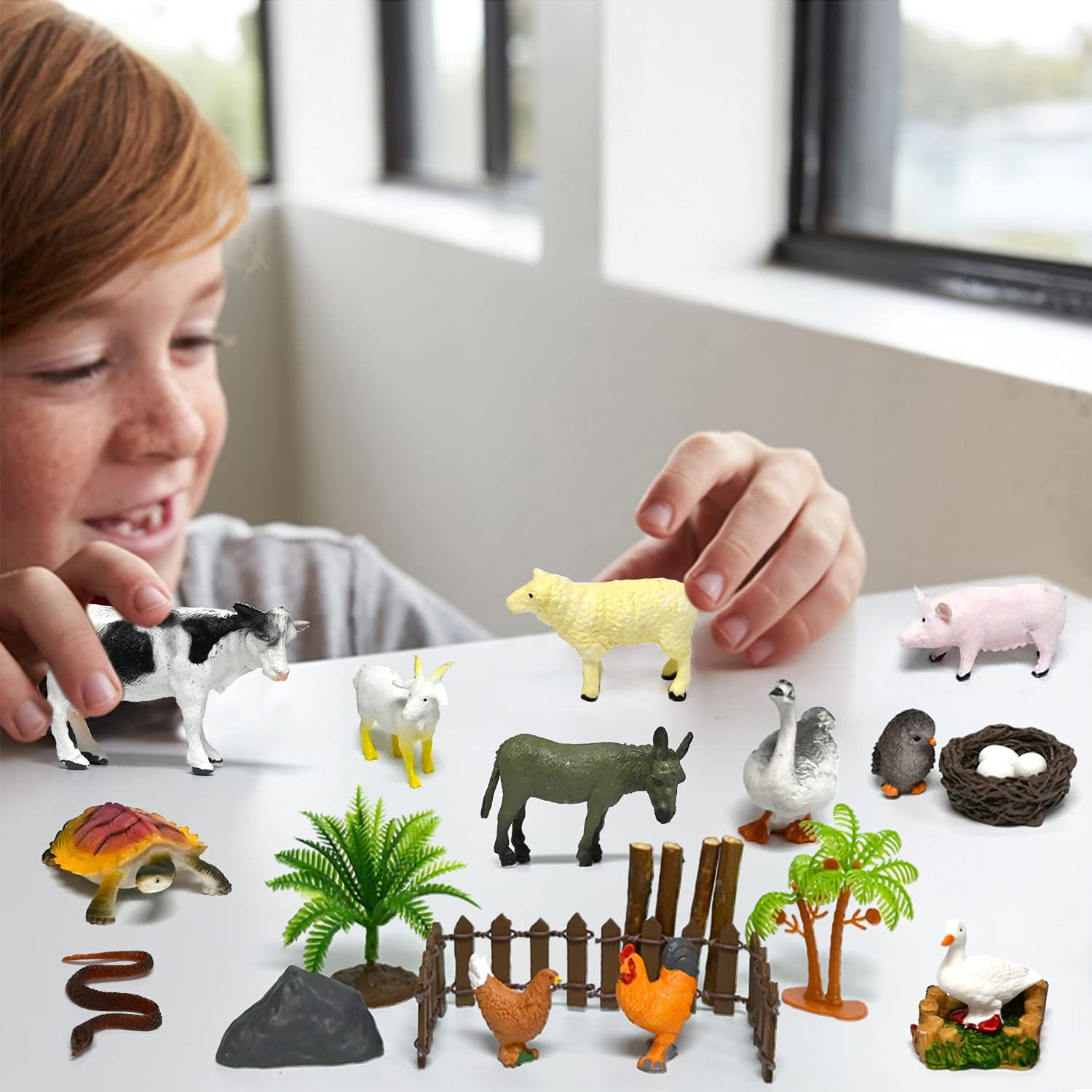 - 【PERFECT EDUCATIONAL TOY】It contains many kinds of common animals, such as chicken, duck, cow, sheep, cat, dog, mouse, snake and fences, trees, stone, trunk with authentic features and coloring based on reality, which can encourages imaginative play and inspires children’s creativity, and expand and develop their vocabulary through enjoyable, educational energy.