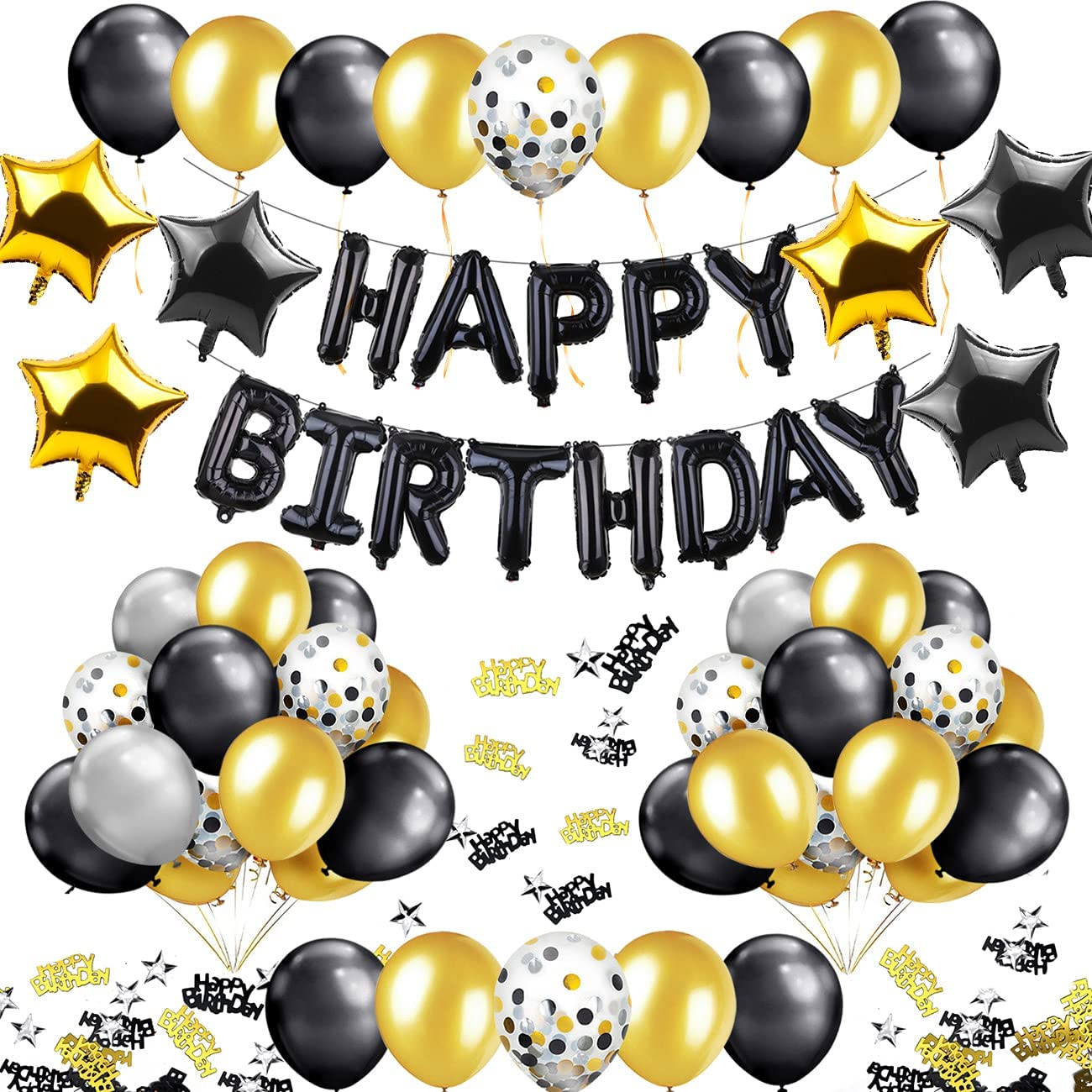 iZoeL Black Gold Birthday Decorations for Men Women Boys, 13pcs Happy Birthday Banner Balloon, 6pcs Star Balloons, 40pcs Latex Confetti Balloons plus 10g Table Confetti, Party Accessories