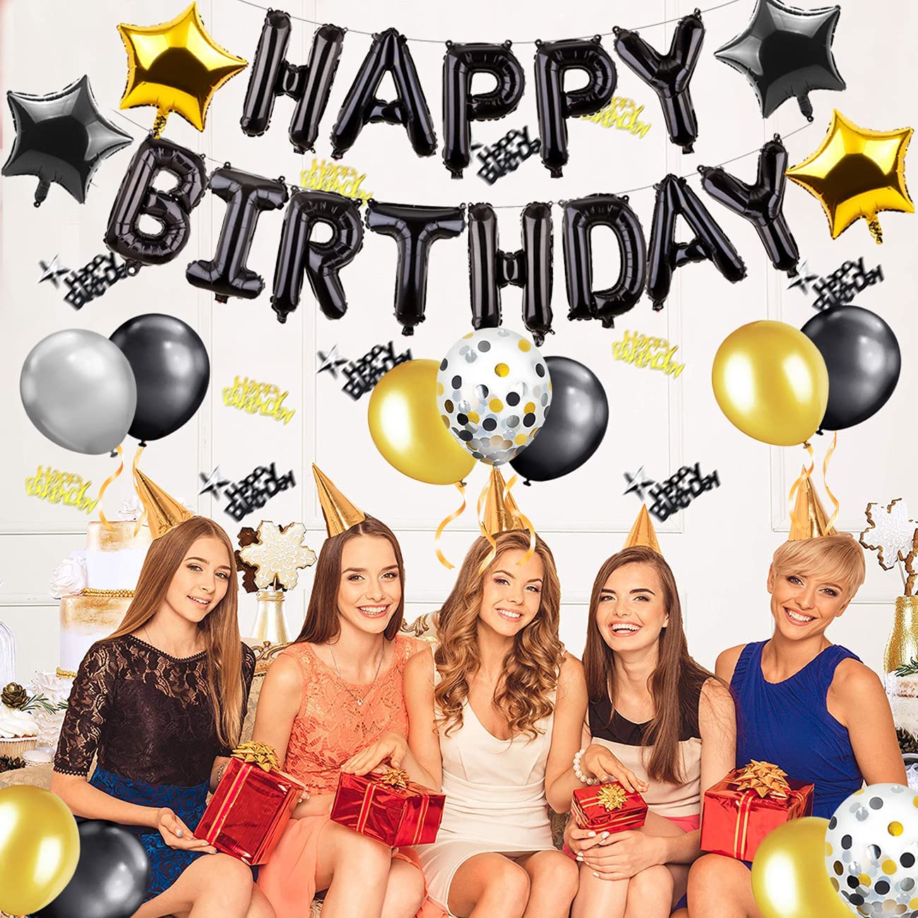 - Black Gold Birthday Balloon for Men: 13pcs HAPPY BIRTHDAY bunting, 6pcs Star balloon, 30pcs latex balloon, 10pcs confetti balloons, 10g birthday table decoration, 20m balloon string, 100pcs stickers. included everything you will need to celebrate the birthday party.
