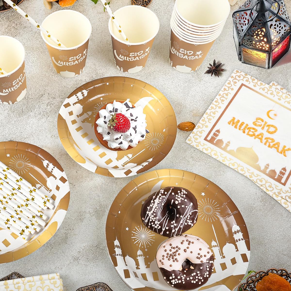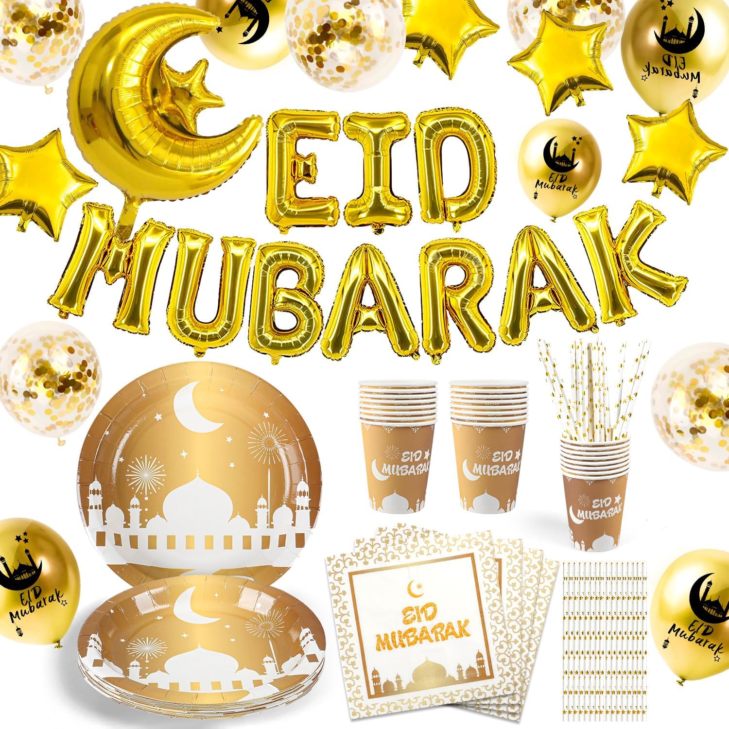 - Ramadan Mubarak Dekoration set: Hängen Sie die Eid Mubarak Girlande hoch auf als Tür Dekoration oder Foto Backdrop,lassen Sie die Ballons hoch fliegen. our Partyteller Becher Strohhalme als Ramadan Tafeldeko. feiern Sie Ramadan Mubarak zu Hause mit Freunden Familien.