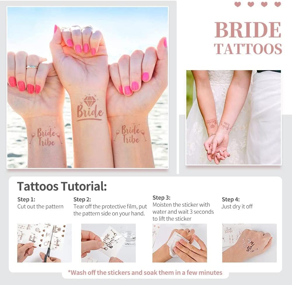 - Glitter Tattoos for Team Bride: Celebrating your hen night with your sisters is one of the most anticipated moments before your wedding. Make sure your team bridal have these fun tattoo tags. Note: Fake tattoos can be easily removed using a sponge and water.