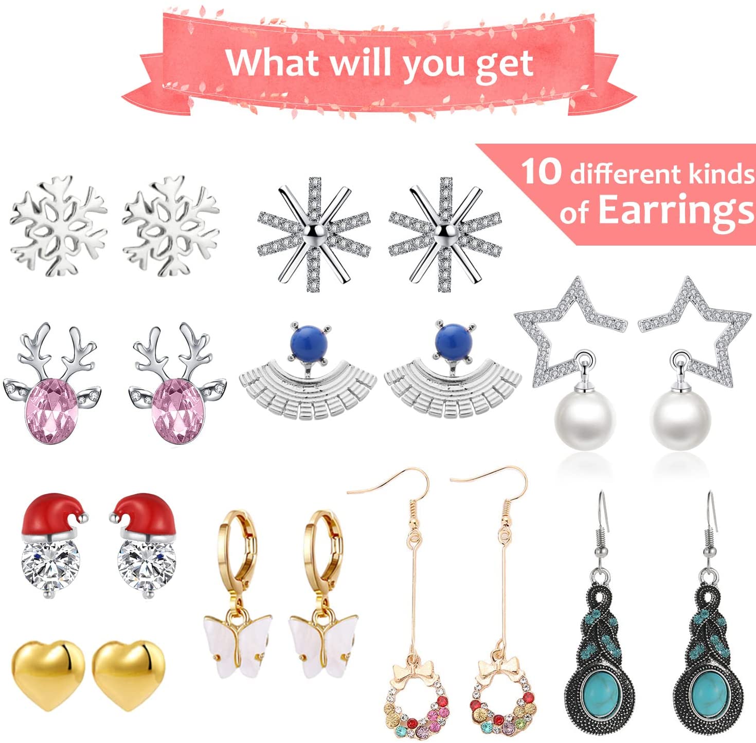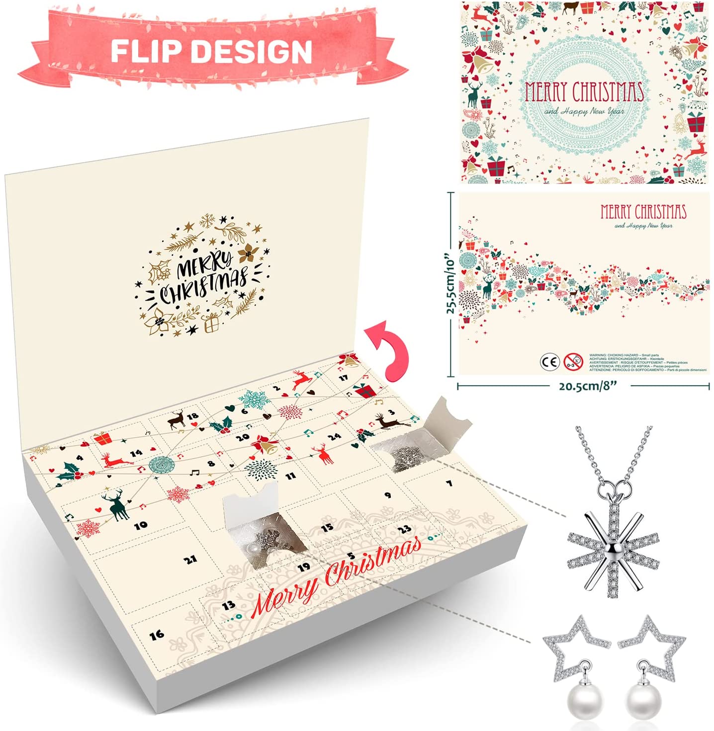 - Xmas advent calendar contains 5 necklaces, 10 earrings, 6 rings, 3 bracelets, 2 shinning charms. 24 premium jewelery after the door guaranteed to turn every door into a highlight.
