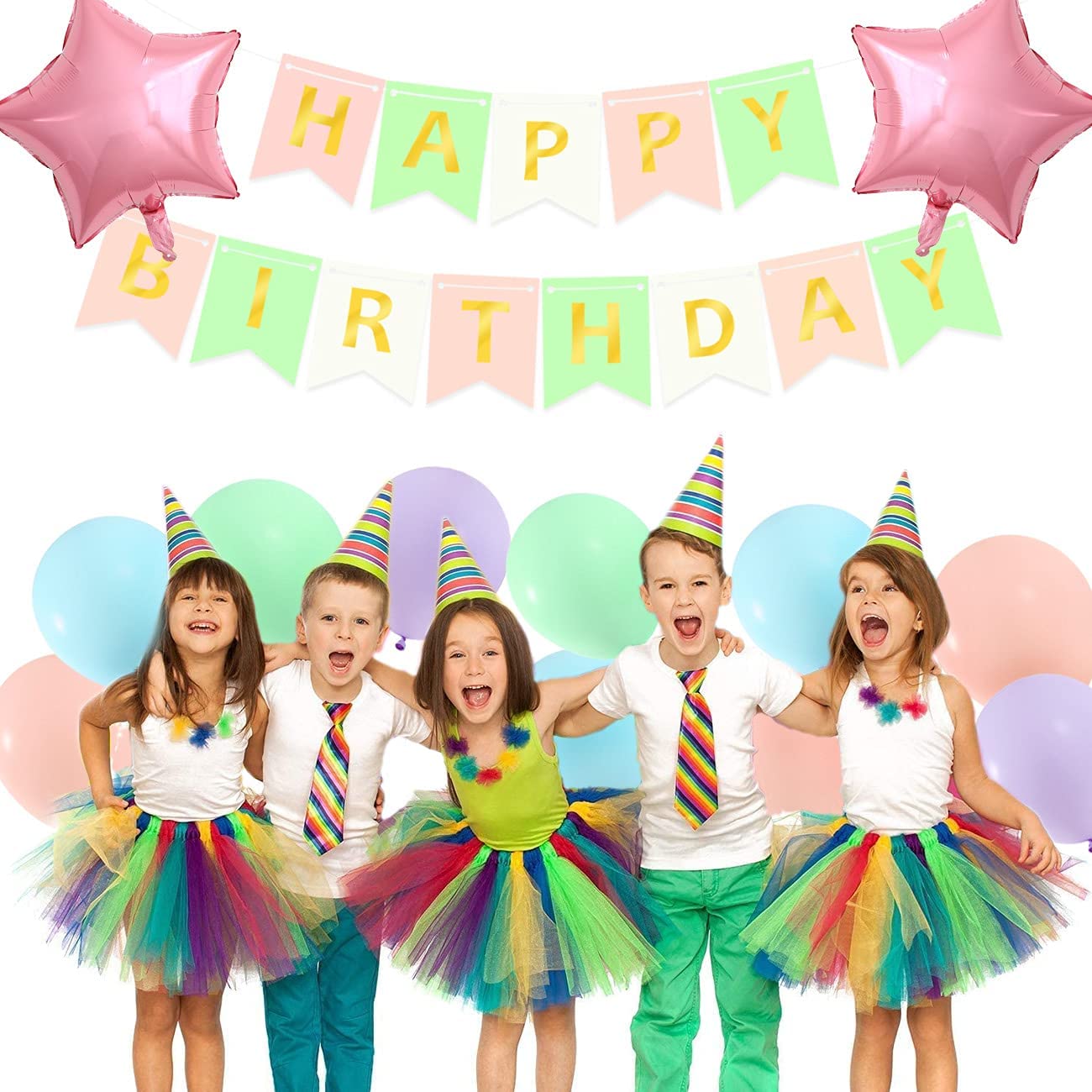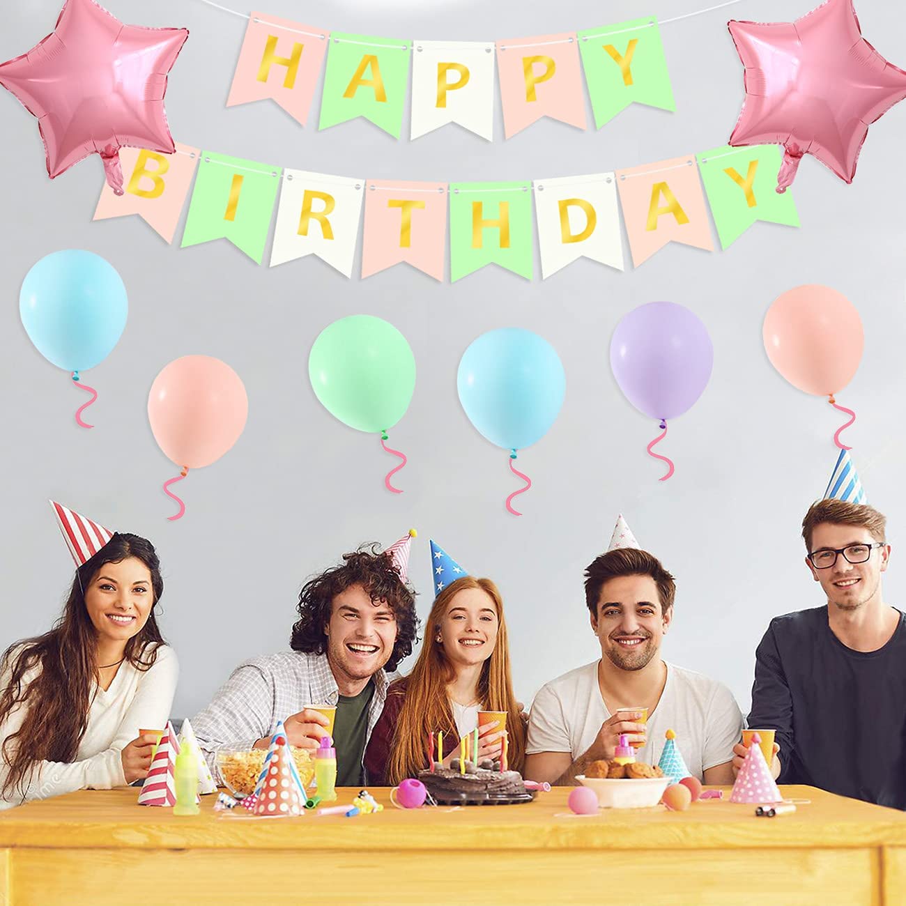 - 🎈 Macaron Birthday Decorations for Girls: Include 13pcs birthday banner, 9pcs balloons (12inch), 3pcs confetti balloons(12inch), 2pcs star foil balloons. Can be assembly in a few minutes.