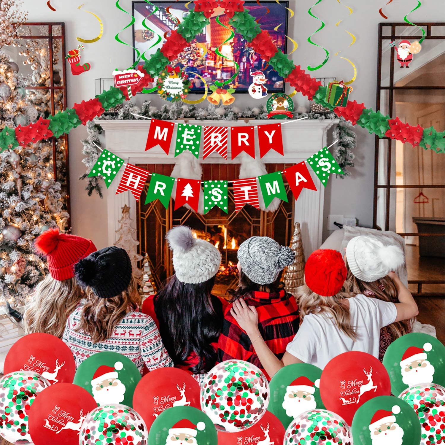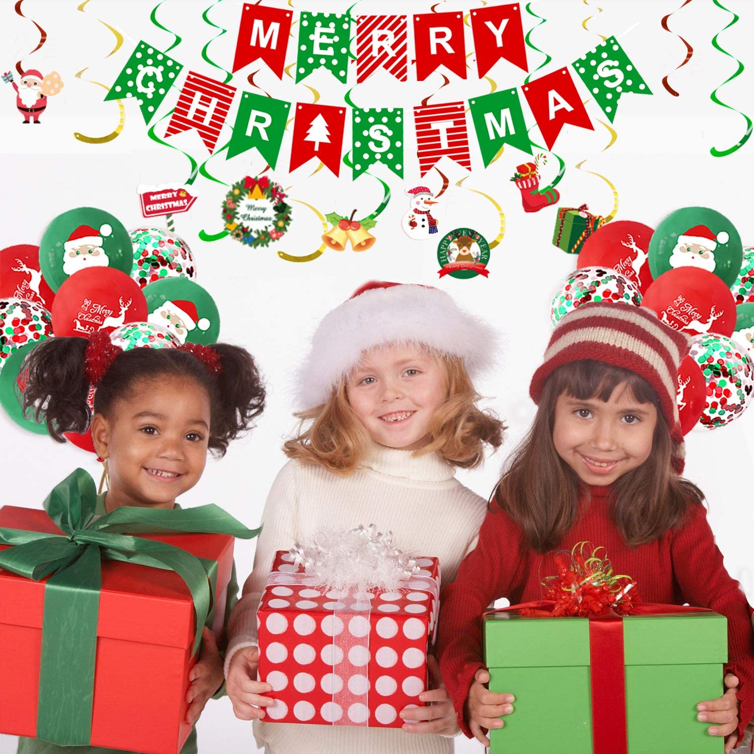 - 【Value Christmas Balloons Set】Contains 14pcs Merry Christmas banner, 9.84ft retro Christmas paper garland, 8pcs Christmas hanging swirl, 15pcs Christmas balloons.