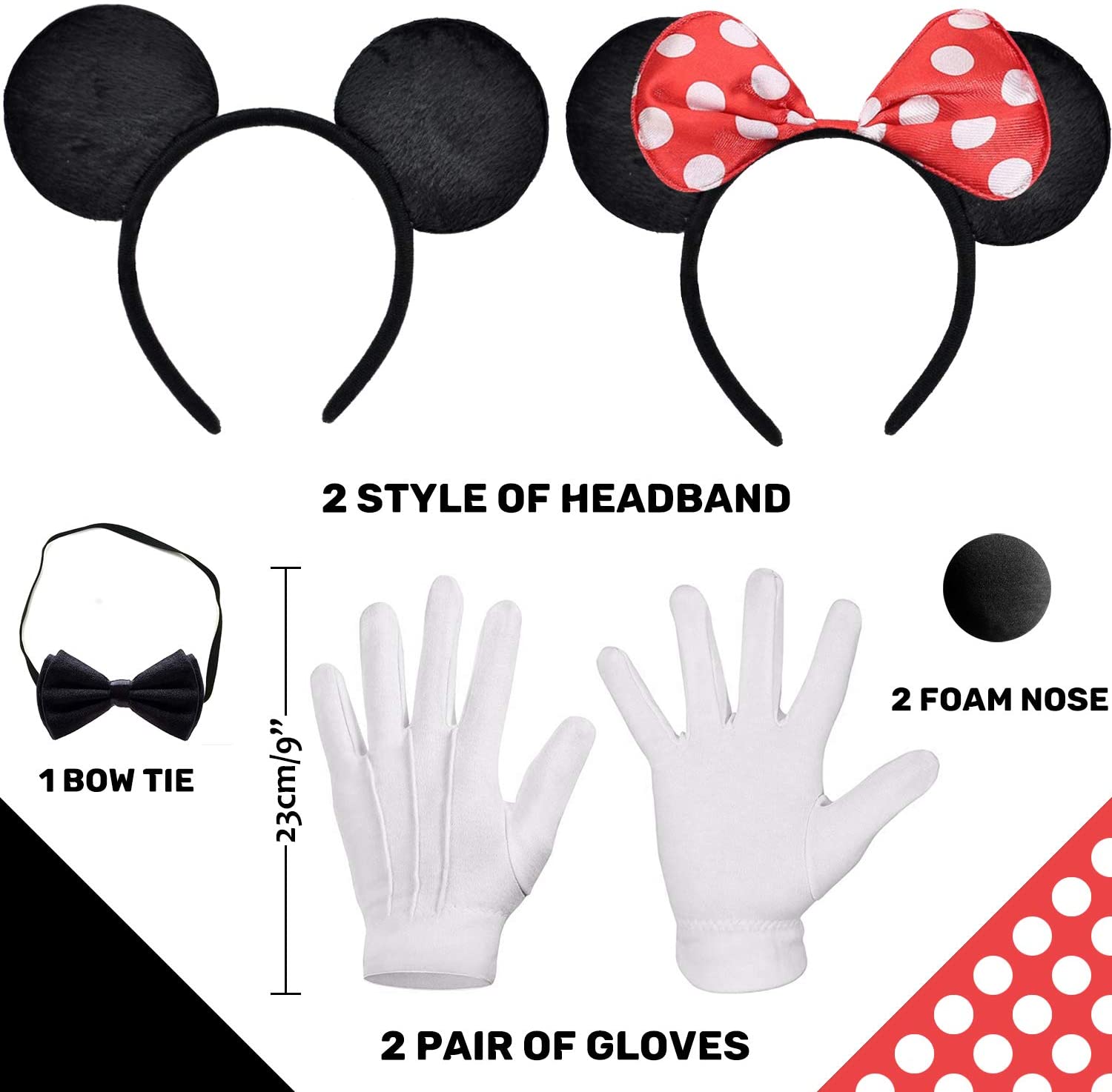 - ♥ Mouse COSTUME Kit incl. 2x bow headband, 4x white gloves, 2x black nose, 1x bow tie bow. Put on them and you will be instantly identified as cute mouse!