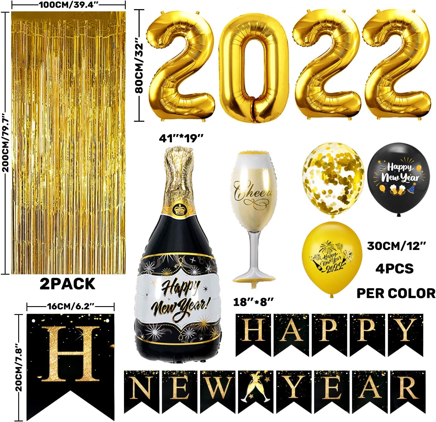 - XXL 2022 New Year's Event Supplies: incl. giant gold 2022 number foil balloons set, 2 gold fringe curtain, 13 black goold happy new year banners, XXL 1 bottle champagne, XXL 1 champagne glass, 12 black gold and confetti balloons. 2 rolls balloons strings. All support helium or air. Enough to decorate a whole hall!