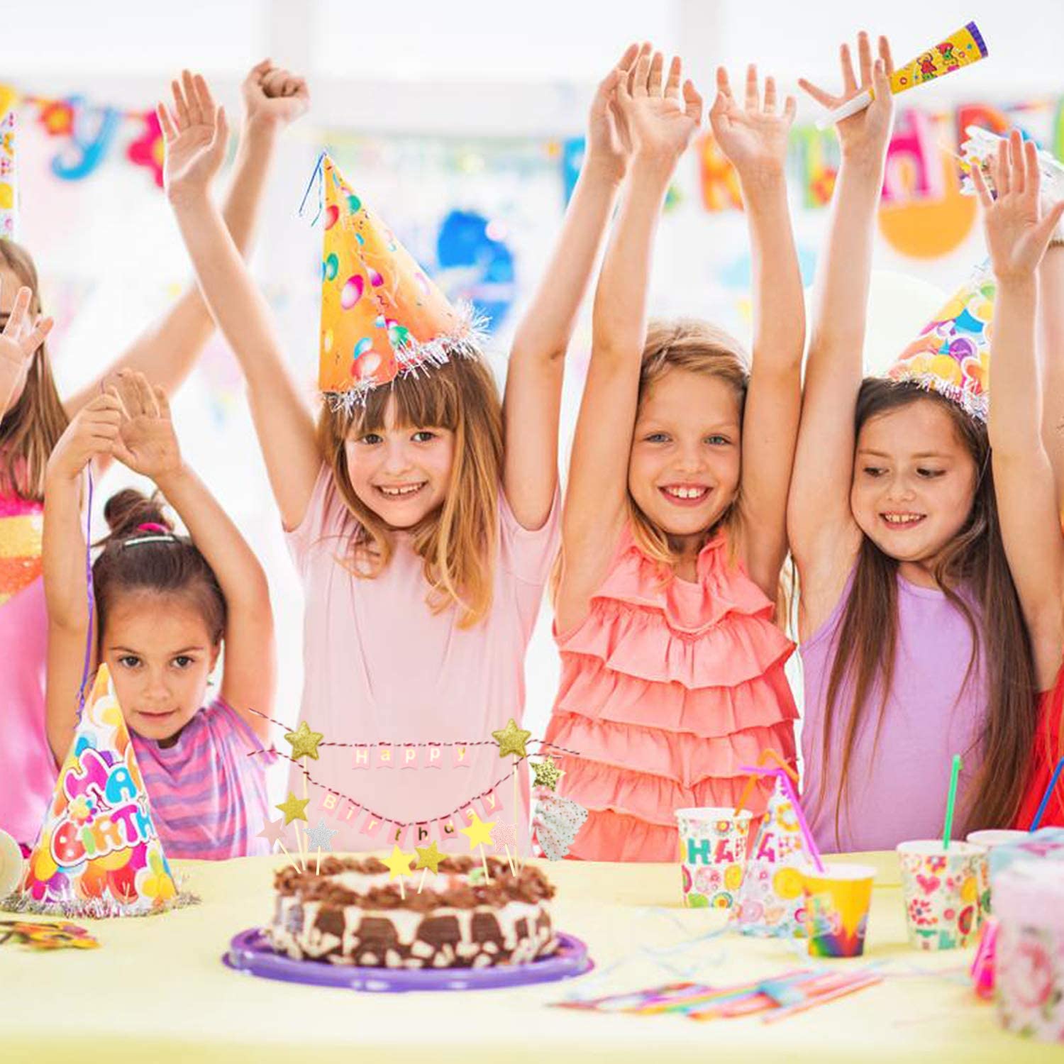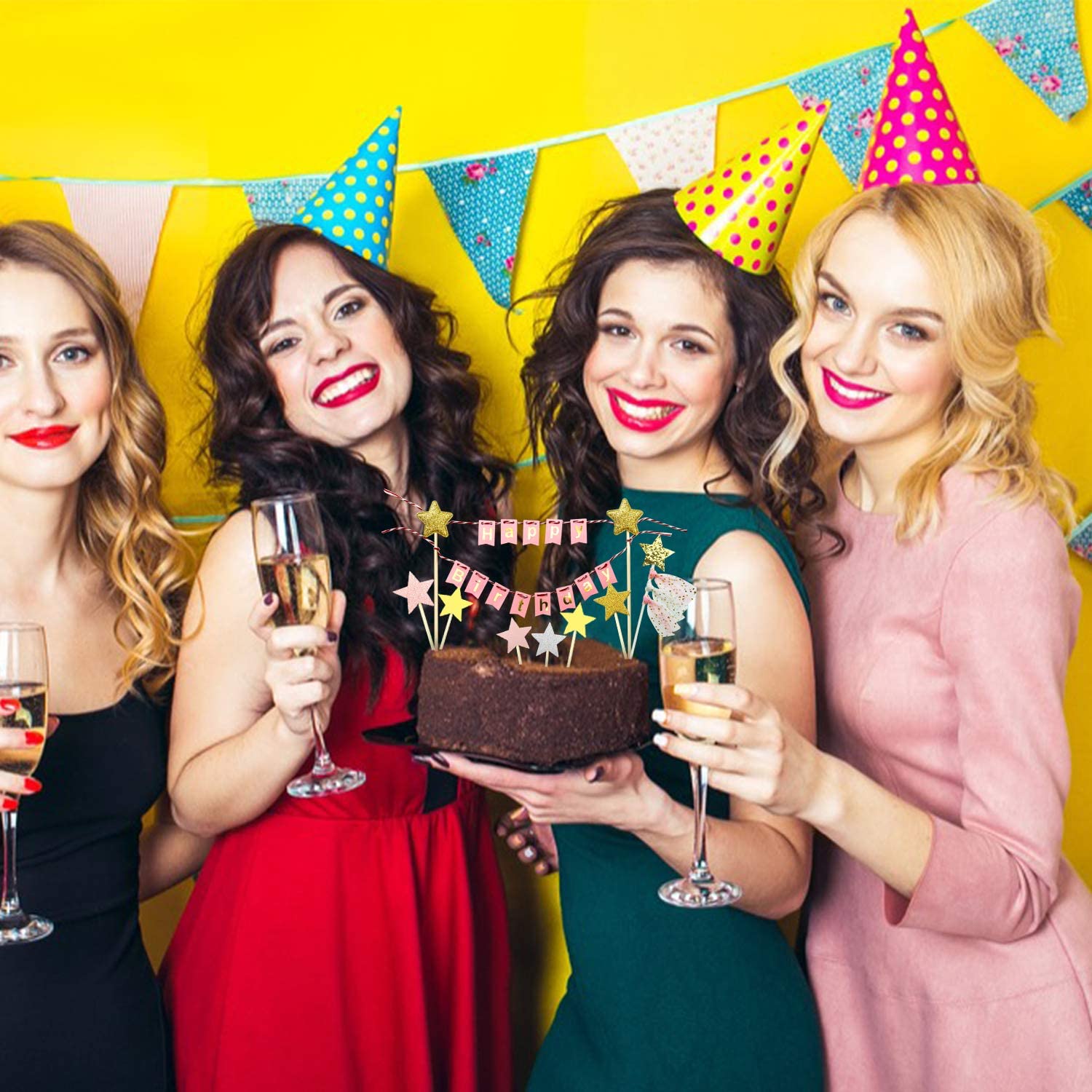 - ♕ Cake Topper Set: 1 * Happy Birthday banner, 1 *shiny star lace , 4 * pink star, 2 * yellow star, 2 * gold star, 2 * sliver star. Fits best on cakes of 6-12 inches.