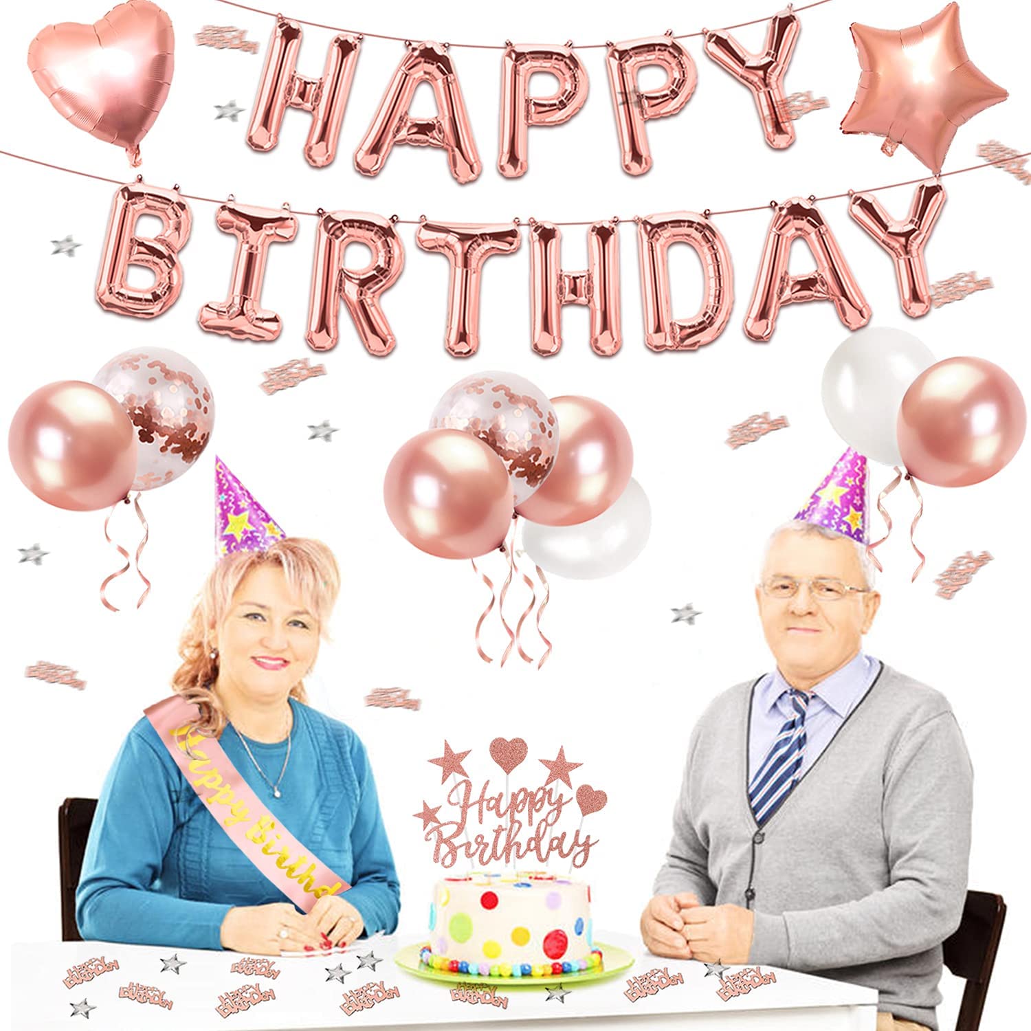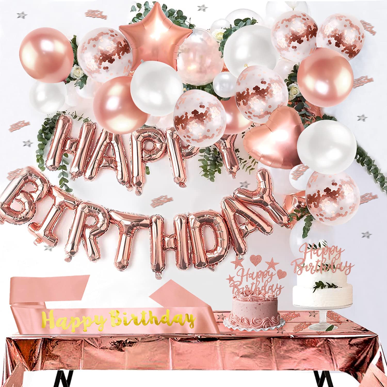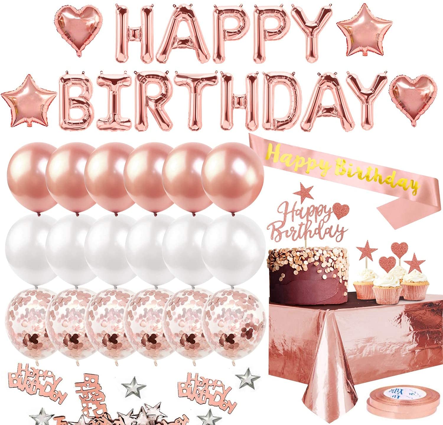 - Rose Gold party Decoration Set: 1pcs rose gold tablecloth, 13pcs Happy Birthday banner, 1pcs birthday sash, 6pcs confetti balloons, 12pcs rose and white balloons, 4pcs heart and star foil balloons, 11pcs rosegold cake toppers, 10g rose gold confetti, 20m ribbons. Add a birthday atmosphere to your birthday!