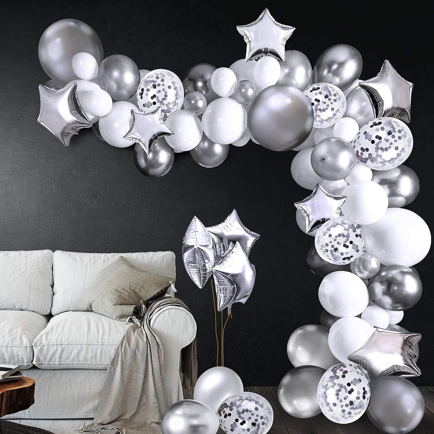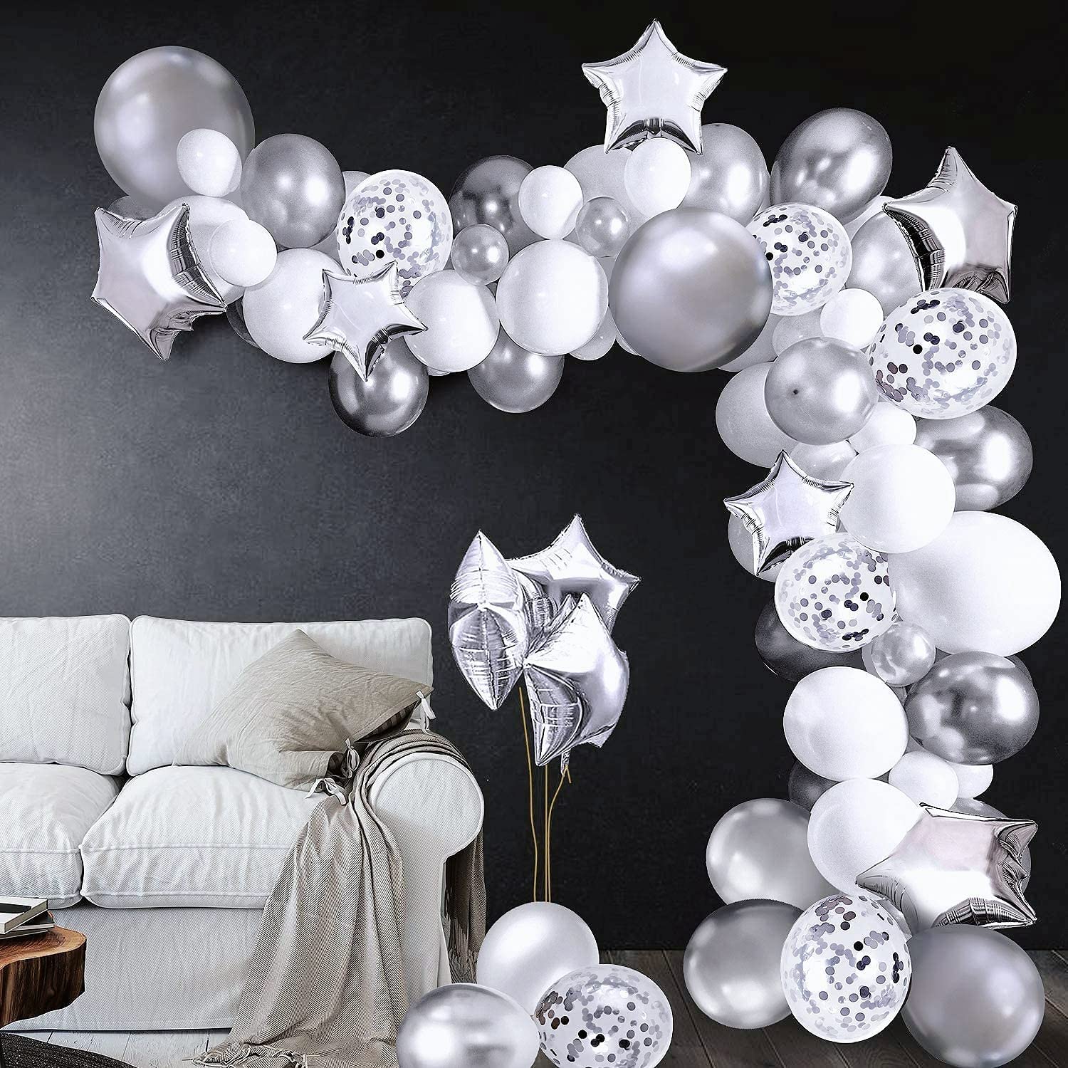 iZoeL Silver Birthday Party Decoration Silver Balloon Arch Garland Kit Latex Confetti Balloons Foil Star Balloon Tape Strips Tie Tools Flower Clips Kid Girl Woman (Silver)