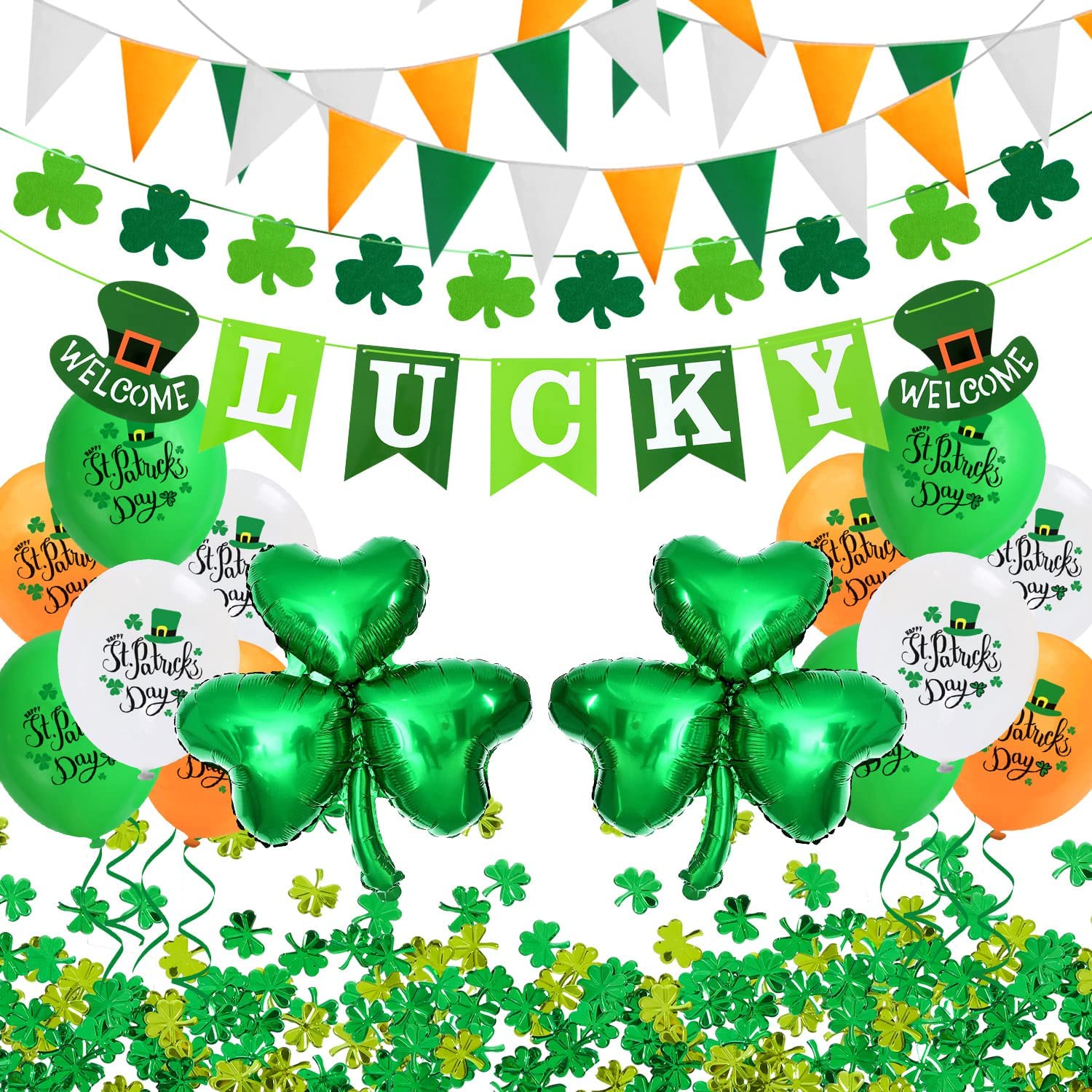 - 【St Patrick Day Accessories】1x WELCOME LUNCKY Banner, 1x 7M irish flag bunting, 1x 3M shamrocks banner, 2 x big shamrock balloons, 15x st patricks day balloons, 15Gx st patricks day Table Confetti. Lovely and vibrant, raise the festive atmospheric of your St. Patrick's Day celebration!