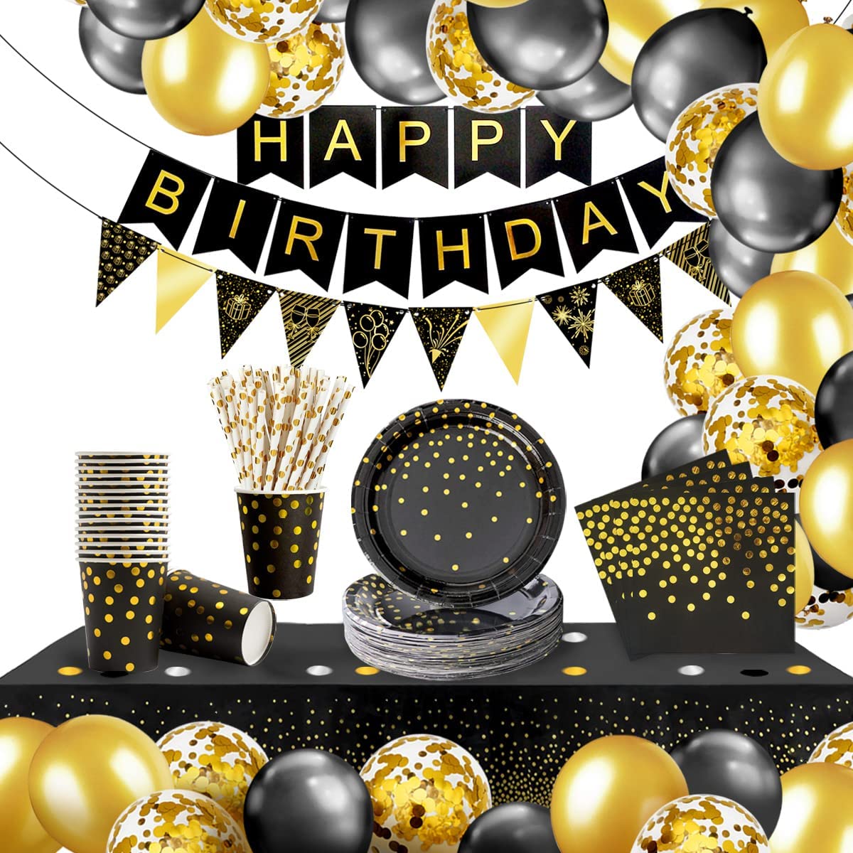- Valués décoration d'anniversaire: "Happy Birthday" bannière, 1*feuille or noir nappe en plastique(2,7 x 1m), 1 * drapeau triange en papier glitter bunting(4m), 46pcs ballon, 1 sac Confetti(10g). 46pcs ballons peuvent faire une arche ballon anniversaire. Remarque : un gonflage à 80 % des ballons fonctionne mieux.