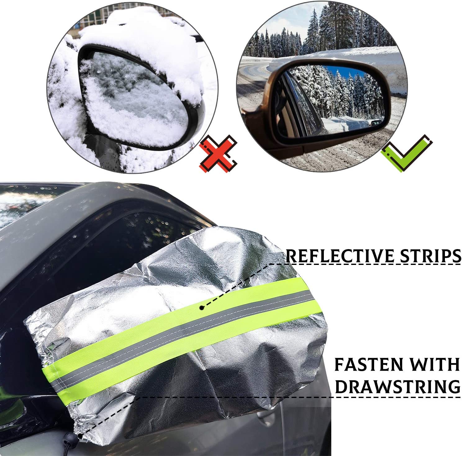 - š Mirror Covers with reflective strips prevent side view mirrors from ice frost, scrapes, bird attacks. Large size of 25*35cm, universal for most verhicles, easy to install, just wear and adjust drawstrings closer.