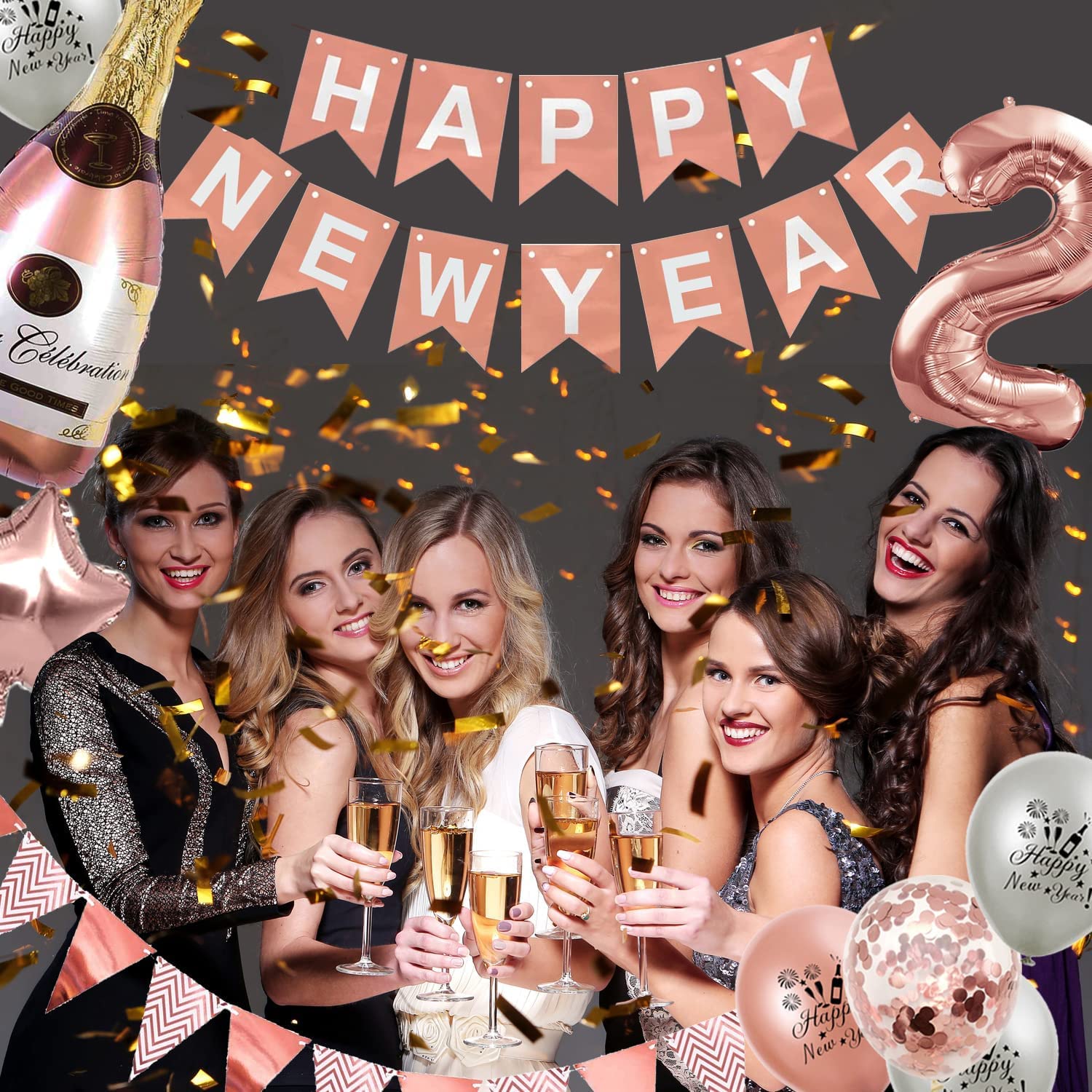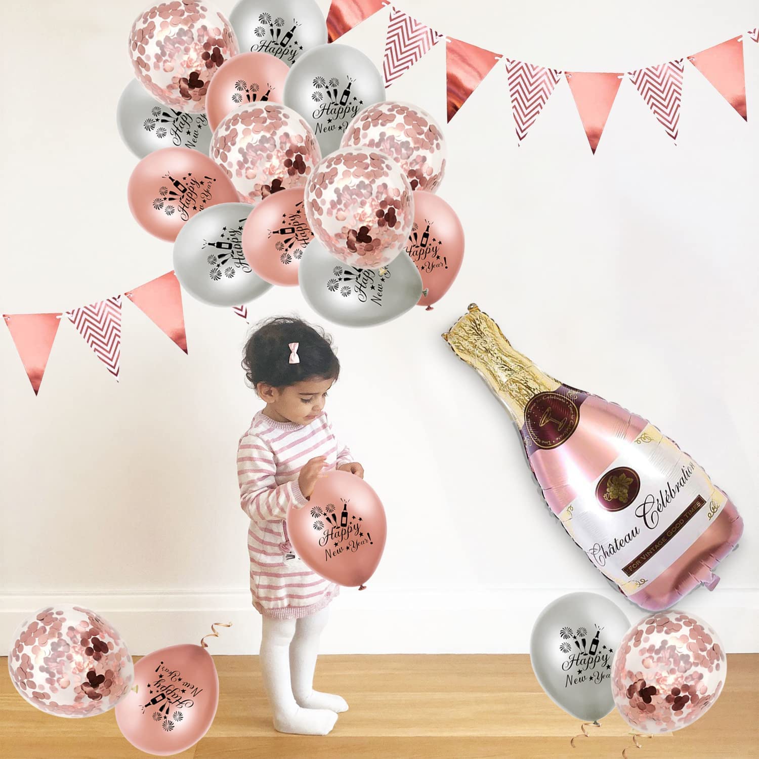 - 🎉 Rose Gold New Years Eve Party Decorations: incl. XXL 2022 balloons 32'', happy new year banners, 2m triangle flag, 40'' bottle champagne, 2 star foil balloons, 8pcs rose gold & silver latex balloons, 4 rose gold confetti balloons, supports helium or air.