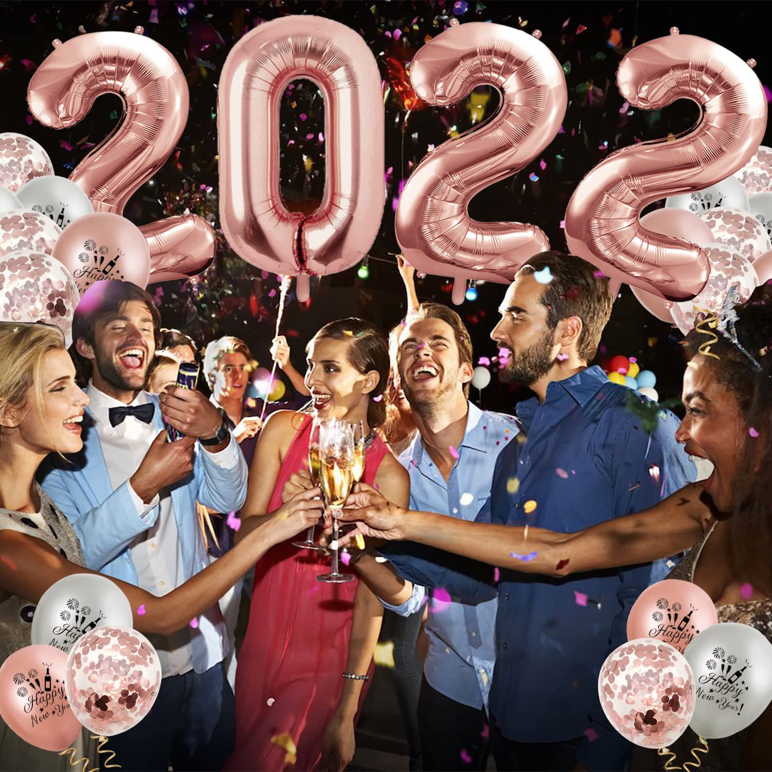 - XXL 2022 New Years Party Pack: incl. giant rose gold 2022 balloons 32'', rose gold happy new year banners, 2 star foil balloons, 8pcs rose gold & silver latex balloons, 4 rose gold confetti balloons, Supports helium or air .